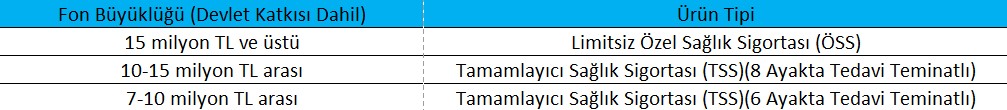 Katılımcının emeklilik gelir planına geçmek için başvuru yaptığı tarihteki fon büyüklüğü dikkate alınarak kendisine aşağıdaki matristen önerilecek sağlık sigortası ürünü belirlenir. Önerilecek sağlık sigortası ürününün hem prim ödeyeni / hem de sigorta ettireni Katılım Emeklilik ve Hayat AŞ olacaktır. Önerilecek sağlık sigortası ürünü ek fayda olarak katılımcılara hediye şeklinde sunulacaktır.